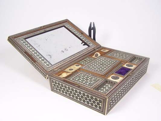 of sarcophagus form with green and white bands of octagonal foliate diaper decoration, the interior with mirror and lidded compartments with reel and bobbin cases and pin cushion, on bun feet