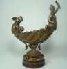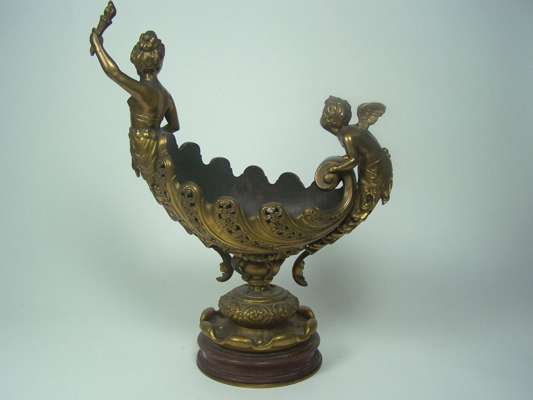 of gadrooned and foliate pierced navette form, with a semi-naked classical female figurehead raising a flaming torch while gazing back at a winged cherub at the stern, on a turned and guilloche cast 'lily pad' support and moulded rouge marble circular plinth base