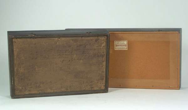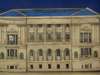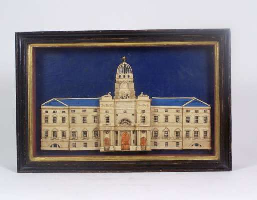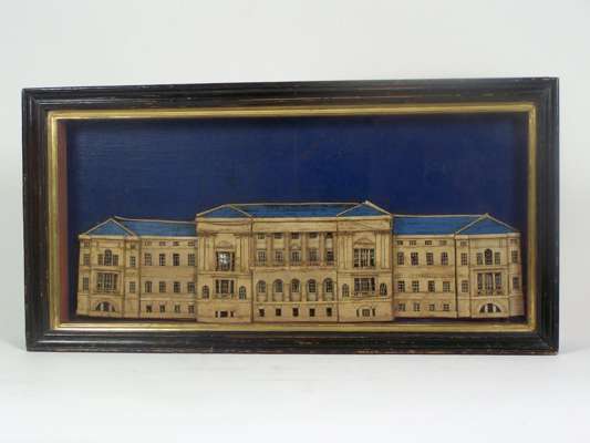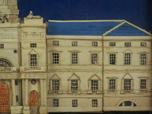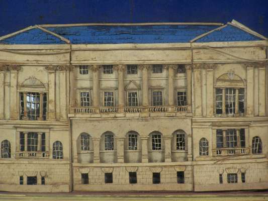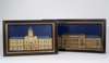 representing two facades of the neo-classical building designed by Robert Adam, each executed in paper on a blue background, within ebonised box frames with gilt slips (2)