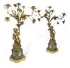 in the form of Bacchanlian cherubs holding aloft cornucopiae issuing flowering stems, each with three lights and beaded nozzles on naturalistic tree trunk cast supports and pedestals with leaf cast volute scroll uprights flanked by blue ground floral panels in the manner of Sevres, on inswept plinth bases (2)