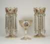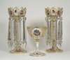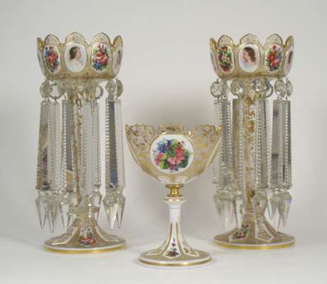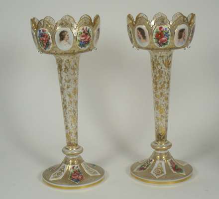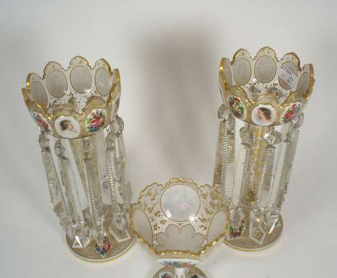 each with a scalloped rim, the bowl above tapering stem and circular foot, the bowl suspending cut glass lustres, decorated allover with gilt scrolling foliage, the body with overlaid oval panels alternatively depicting sprays of flowers and figural busts, the foot with alternate panels of flower sprays and gilt scrolls, 35cm high; together with a smaller vase of similar design, with circular panels to the bowl, 20.5cm high (3)