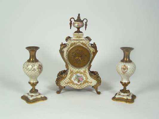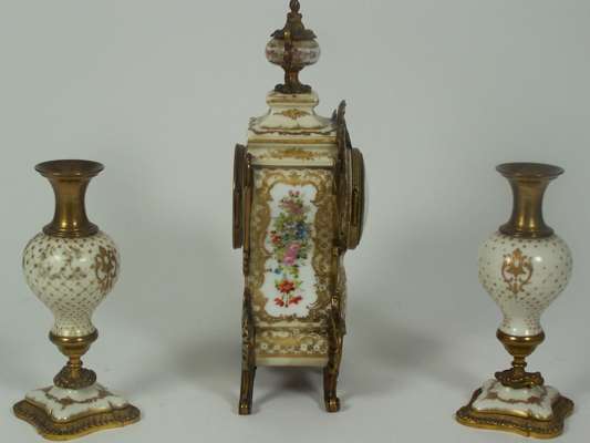 A 19th century porcelain and gilt bronze mounted clock garniture In the Louis XV style