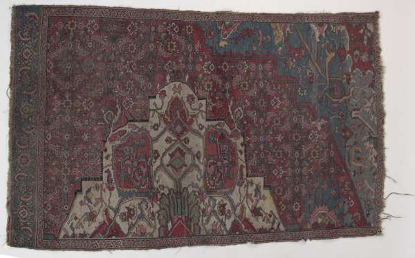late 19th/early 20th century, the red field with ivory half medallion, blue spandrel to one end and blue border to the other end
