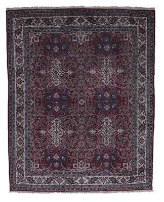 late 19th/early 20th century, the red field with ivory and indigo arabesque cartouches amidst scrolling vine, within ivory palmette, cartouche and scrolling vine border between blue and indigo bands