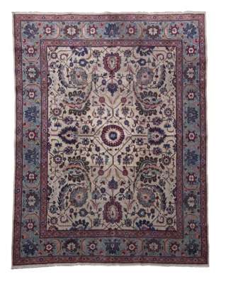 early 20th century, the cream field with central rosette and allover palmette and foliate vine lattice, within blue palmette and foliate vine border between salmon pink bands