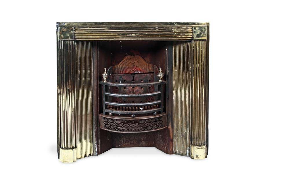 the rectangular reeded bolection frame with plain capitals and reeded inner sleeves, the bowfront iron grate with brass finials and pierced apron, the fireback crested with a swan-neck 'pediment' enclosing a Scots thistle within a shield