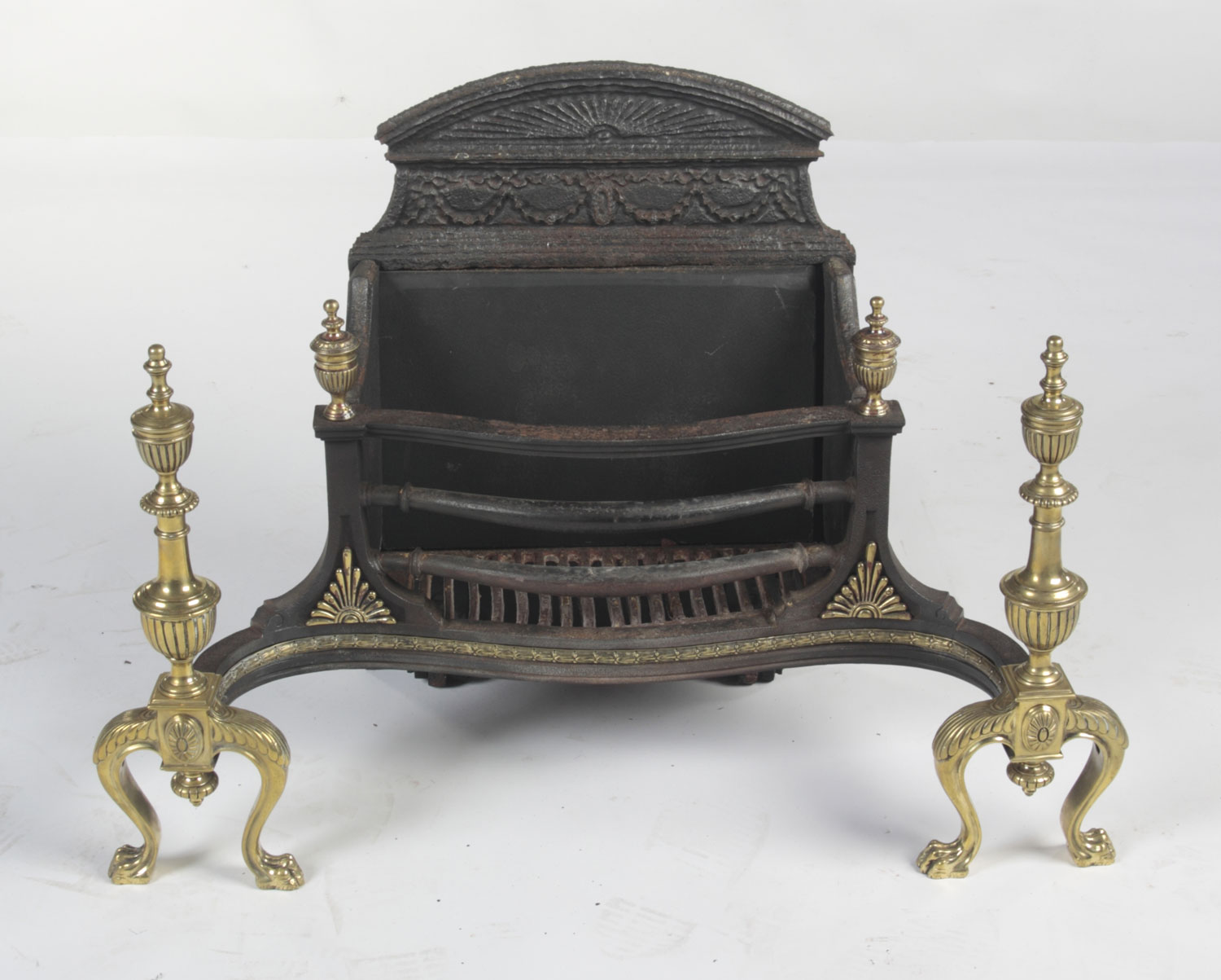the arched fan cast fire back with swagged frieze above a basket headed by finials and brass anthemion corner mounts with a brass laurel leaf banding to the apron, the andirons of gadrooned baluster form with urn finials, on leaf cast cabriole legs with paw feet centred by fan paterae