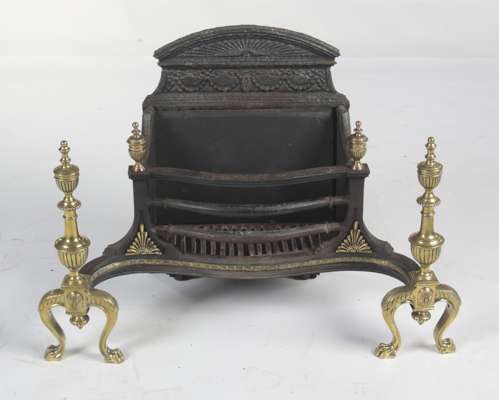 A George III cast iron and brass basket grate In the manner of Robert Adam