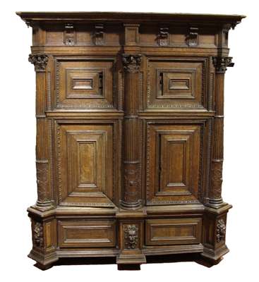 the projecting dentil cornice with bracket pendants above a two pairs of panelled and graduated doors with egg and dart decoration and guilloche to each stile, divided by three fluted Corinthian pilasters with strapwork carved surbases, the sides decorated with pairs of architectural style arches, the skirted plinth with five boldly carved lion masks, on bun feet