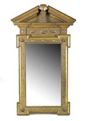 the architectural 'stipple' textured frame with broken triangular pediment and central scallop shell above a sunken field re-entrant frame decorated with sea shells and a rope twist inner slip around a silvered plate of thin guage