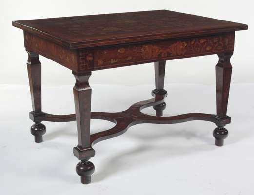 the rectangular top with a symmetrical composition of scrolling summer flowers within a foliate outer border above a full width frieze drawer, on square tapering legs united by flat serpentine X-stretcher ending in bulb-turned feet