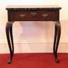 the top of serpentine outline above a cockbeaded frieze drawer with engraved brass handles and escutcheon, on cabriole legs ending in pad feet