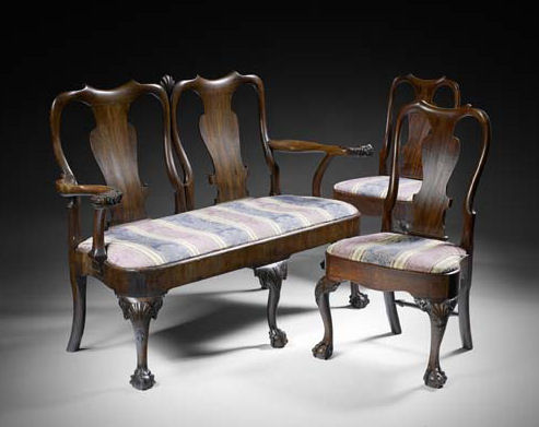 the curved back with double paper scroll crestings flanking a central carved scallop shell above a pair of solid vase-shaped splats, similarly carved with scrolls, the outscrolling arms boldly carved with lion masks, each with bared teeth and finely carved trailing manes, the balloon-shaped drop-in seat, with a caddy moulded rail and damask upholstery, on three front scallop shell and leaf carved cabriole legs ending in claw and ball feet, the two rear legs of plain outswept form; together with a pair of associated side chairs, of near-matching design (3)