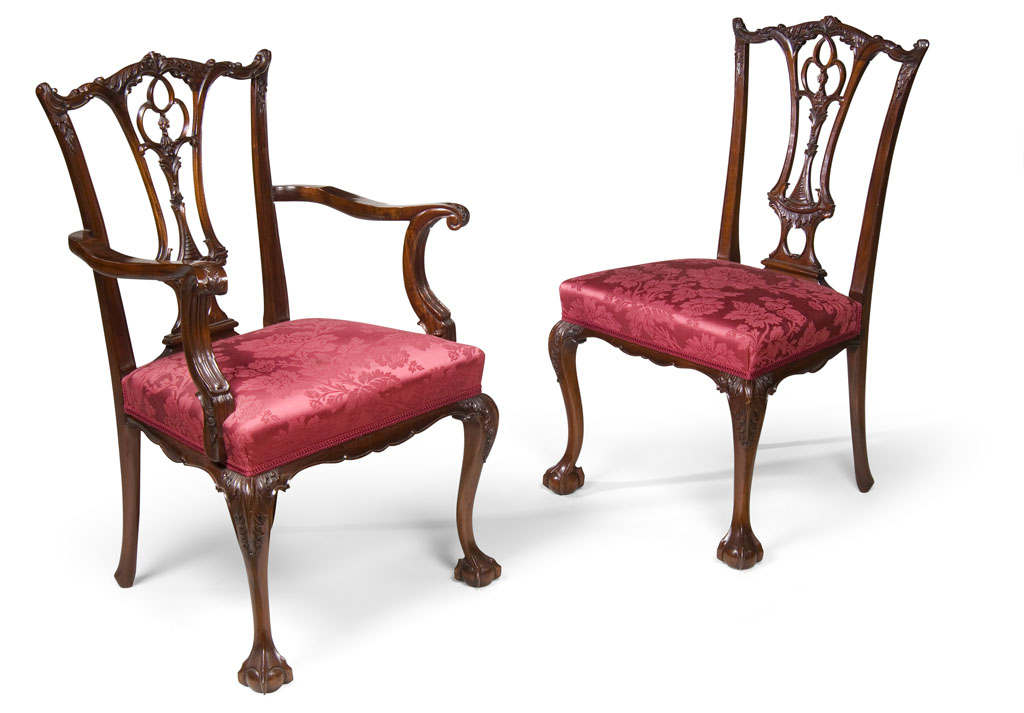the shaped backs with pierced splats, overstuffed seats with shaped aprons and raised on cabriole legs ending in ball and claw feet