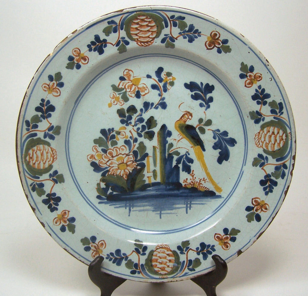 decorated to the border with pine cones and scrolling foliage and to the well with a parrot perched on a rock amongst flowers and foliage