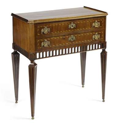 the tray top with canted corners and galleried edge above two full width frieze drawers with neo-classical giltmetal handles and escutcheons and a pierced arcaded apron, on angled fluted tapering legs ending in brass ball feet