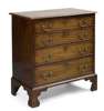 of small proportions, the rectangular top with moulded edge above four long graduated and cockbeaded drawers with foliate cast brass handles, on shaped bracket feet