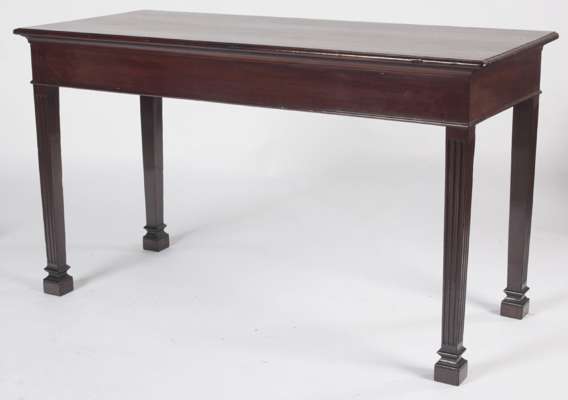 the rectangular top with ovolo moulded edge and plain frieze with moulded lip, on fluted tapering square section legs with guttae feet