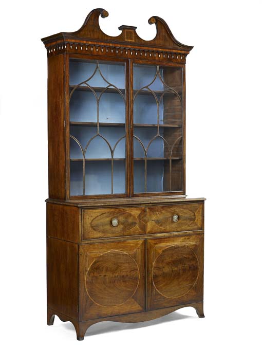 the swan-neck pediment with arcaded frieze and ivory pendants above a pair of glazed doors with ogee astragals enclosing slotted shelves, the lower part with a secretaire drawer enclosing a fitted maple veneered interior of pigeon-holes and drawers above a pair of cupboard doors enclosing slides, on shaped apron and splayed bracket feet