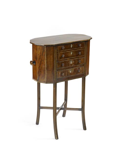 the hinged top with faceted bow ends enclosing cotton and wool compartments, the front with two blind above two working drawers, the rear with four simulated drawer fronts, with turned carrying handles, on splayed square section legs
