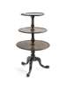 of three dished and graduated circular tiers, each with a channel moulded edge, on spirally reeded baluster supports and cabriole tripod base with pointed pad feet and castors
