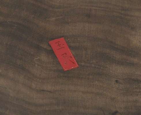 depicting a standing man with a hammer and and a kneeling woman, between a wooden barrel with laundry and two small ivory baskets, red seal mark (damages)