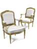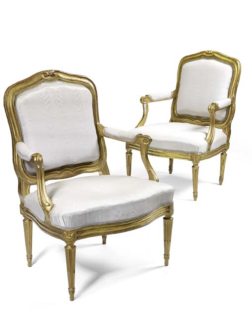 the scroll carved cartouche shaped backs above outscrolling padded arms and serpentine seats with moulded rails and upholstered in ivory damask, on turned and stop-fluted tapering legs headed by paterae (2)