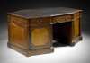 the top of octagonal outline with tan leather skiver, moulded edge and three cockbeaded drawers to each side flanked by simulated drawer fronts at each end, the pedestals of angled form with opposed cupboard doors between sunken field pilasters, the doors and sides decorated with beading and a carved rosette to each inswept corner, on plinth base