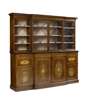 the faux dentil and harebell inlaid cornice above four thirteen-pane astragal doors enclosing lined shelves, the lower part with a faux fluted frieze and four plum-pudding veneered and crossbanded doors decorated with satinwood and harewood fan paterae and ribbon-tied swags, with subsidiary chevron bandings, on plinth base