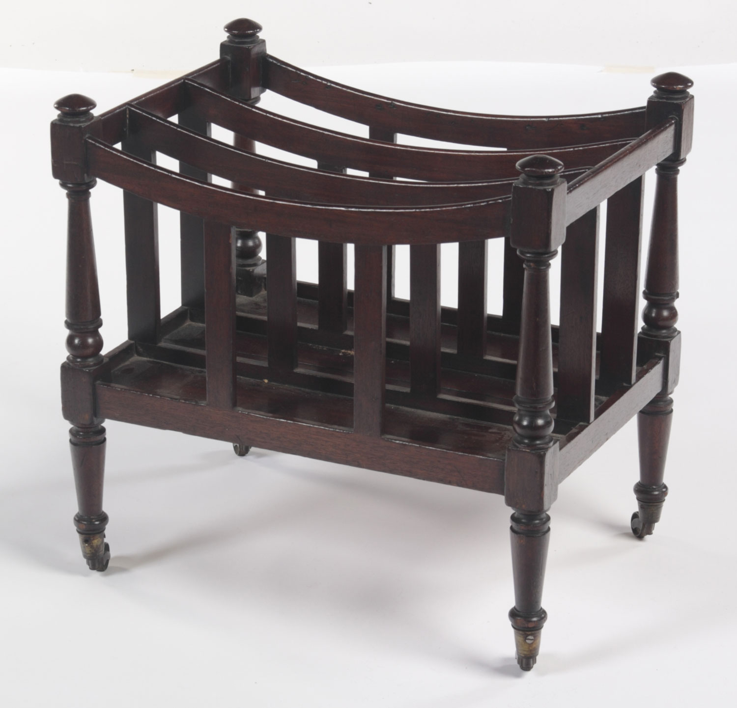 of plain slatted three division form with turned finials and lotus turned uprights, on short turned tapering legs ending in brass scoket castors
