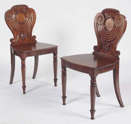 the cartouche shaped backs carved with reeded scrolls and anthemia above solid bowed seats, on lotus turned tapering legs (2)