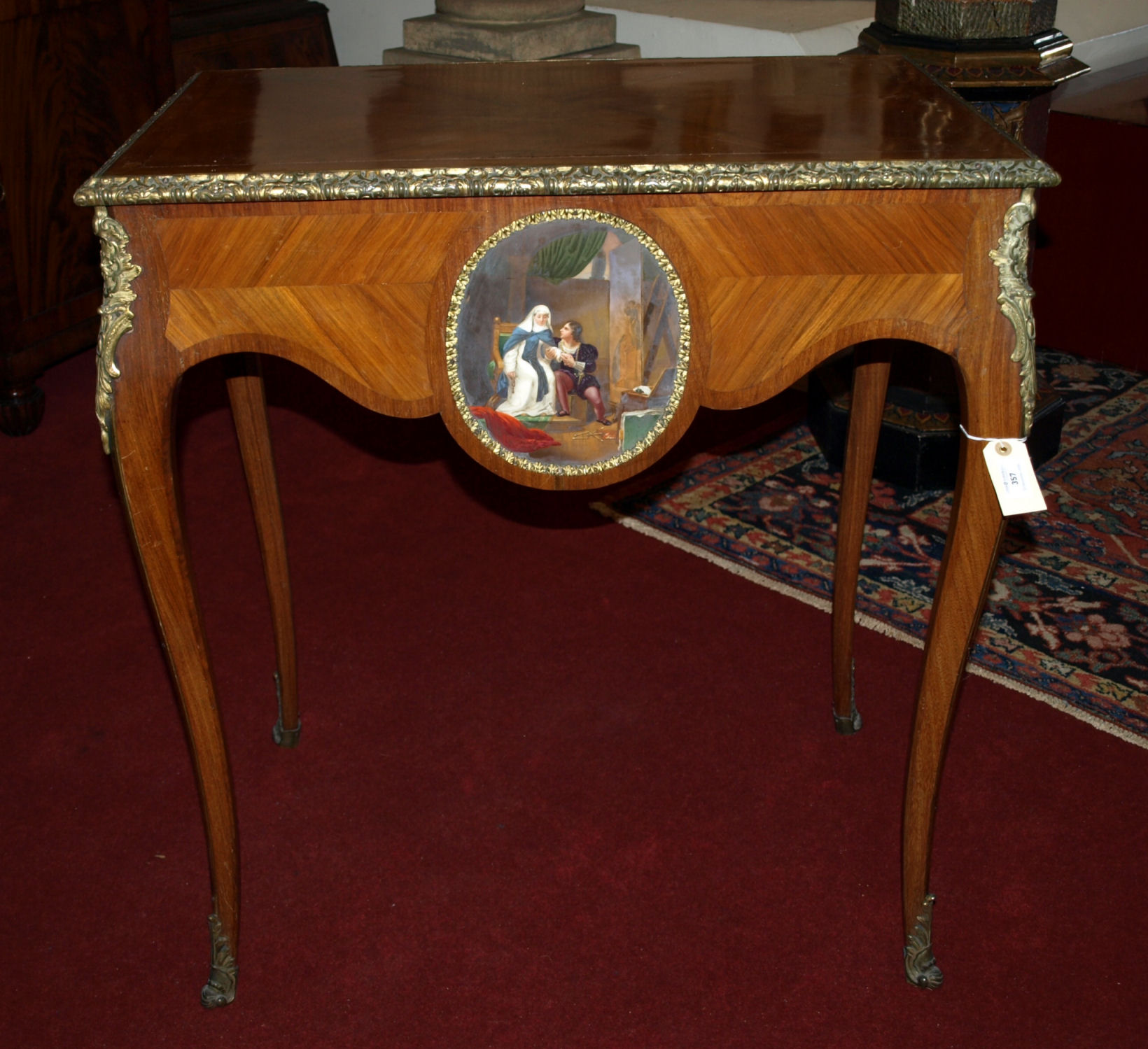 the rectangular quarter veneered top above a deep serpentine shaped apron mounted with a Berlin style oval porcelain plaque depicting a chivalric scene, the sides with similar panels depicting birds within landscapes, on cabriole legs, the whole with foliate gilt metal mounts and sabots