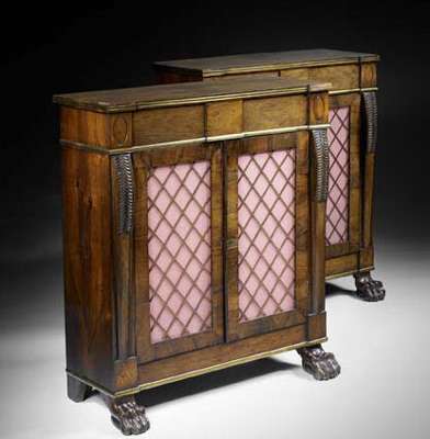 each with a crossbanded inverted breakfront top above a panelled frieze and a pair of brass trellis doors, backed by burgundy silk, enclosing a shelf between stiff leaf carved pilasters with oval capitals, on boldly carved front facing paw feet (2)
