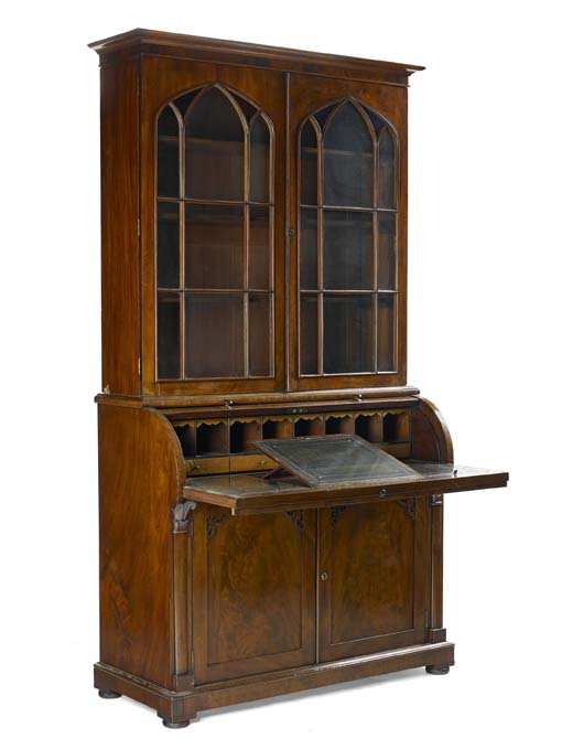 the projecting cornice above a pair of arched and partly rose-tinted astragal glazed doors enclosing adjustable shelves, the cylindrical fall enclosing a fitted bird's eye maple veneered interior of drawers and pigeon-holes above a slide with three leathered skivers and a pair of cupboards with fretted spandrels between pilaster with lappet carved capitals, on plinth base