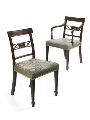 the moulded bar backs above lattice framed middle rails with central tablets above needlepoint stuffover seats, on square tapering legs ending in spade feet, including two carvers (8)