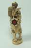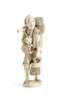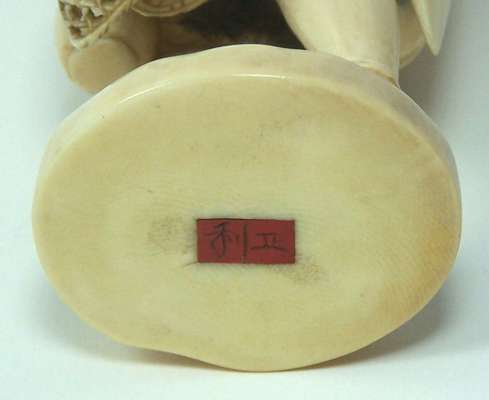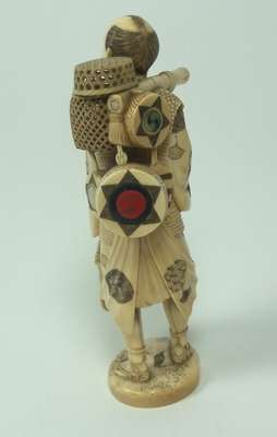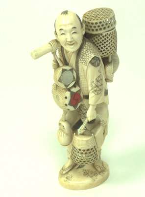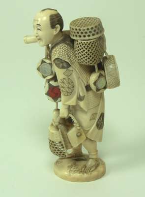 carrying various baskets in both hands and on his back, his clothing decorated with red, green and mother-of-pearl inset roundels, red seal mark.