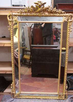 the rectangular plate within a ribbon carved frame and pierced acanthus corners below a torch and quiver surmount centred by two doves and flanked by festoons of flowers, the canted marginal plates within a beaded inner slip with lyre motifs to each corner