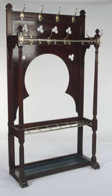 each of rectangular form pierced with quatrefoils around an open Moorish arch flanked by brass coats and ring turned columns with palmette shaped finials, united by brass stick rails with detachable metal drip trays, on trestle feet (2)