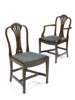 the trefoil arched backs above pierced and anthemion carved backs and dipped drop-in seats with green tapestry upholstery, on fluted square tapering legs ending in spade feet, including two carvers (8)