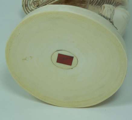 standing with one crane on his shoulder and one at his feet with a bird in its mouth, with a basket on his hip and with a tree stump by his feet, inset red signature panel
