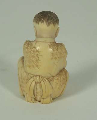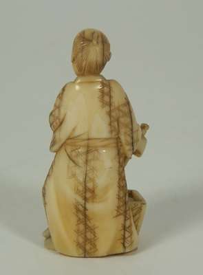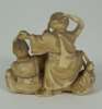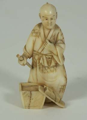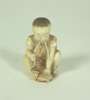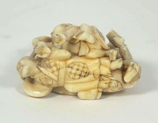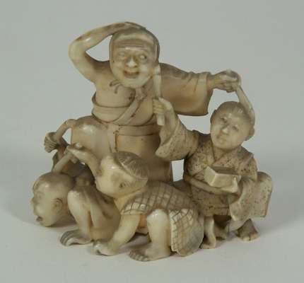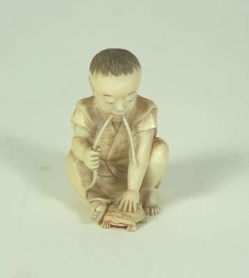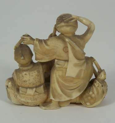 comprising: a figure group of an old woman with two children all crouching on the prostrate form of a man, 5.5cm high, a man with a basket at his feet and tool in his hand, 7cm high, and a child crouching and playing with a terrapin, 6cm high (3)