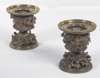 of campana form, the broad dished circular rims above bold relief cast landscapes with flowering branches and dragons, the key fret cast socles raised on pierced and cast vines of blossoming flowers, on moulded circular feet (2)