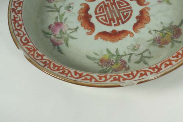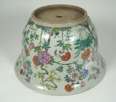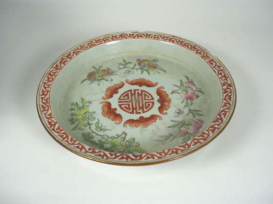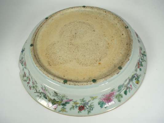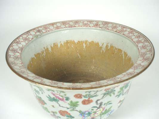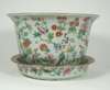 the everted rim is decorated with stylised red painted flowerheads in a geometric pattern, the body is decorated with bold chrysanthemums and prunus blossom; together with a matched underplate (2)