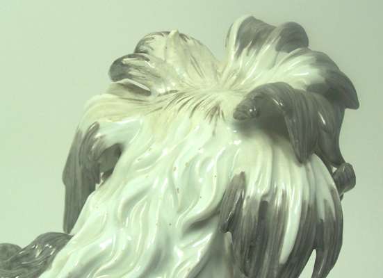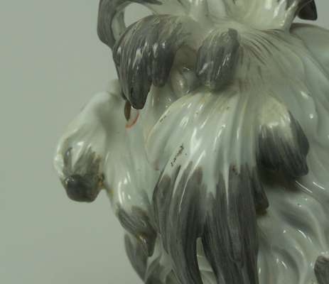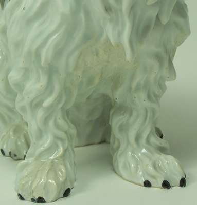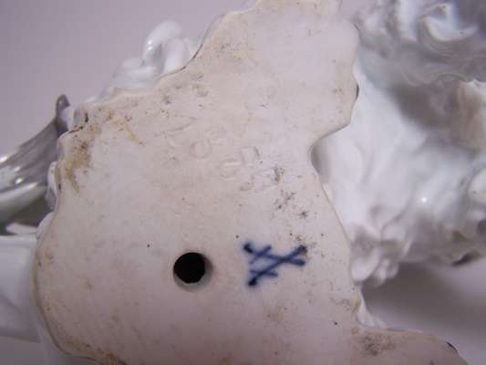 seated with a curled tail and a grey and white coat. Impressed with number 1880 and there is a blue painted crossed sword (restorations)