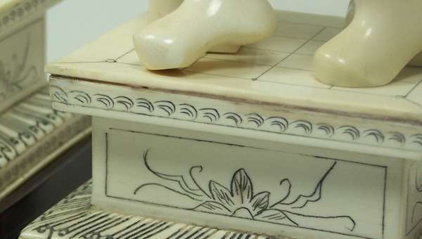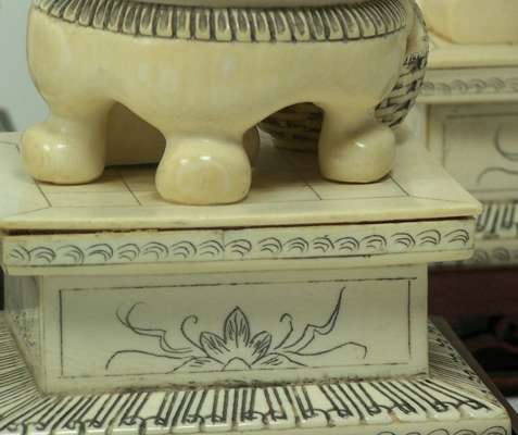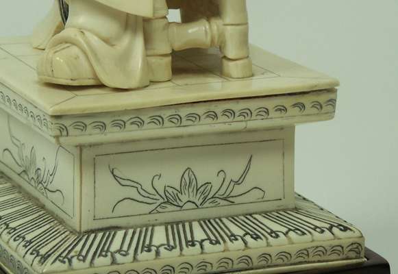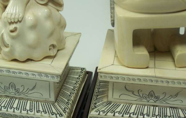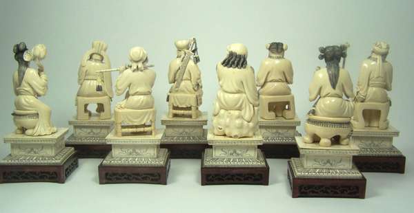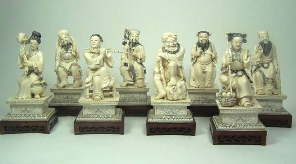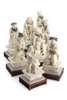 each carved with his or her attributes, with black highlighted areas and raised on a stepped square base (8)