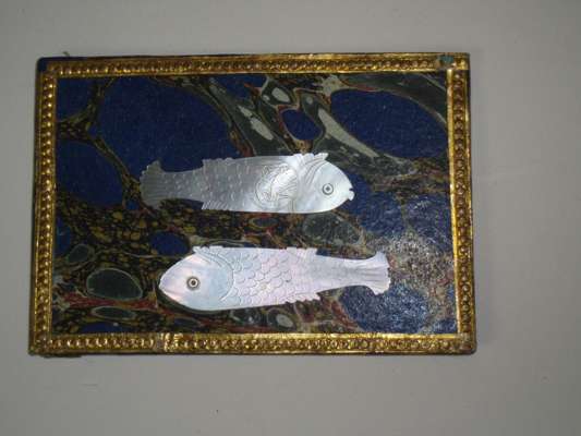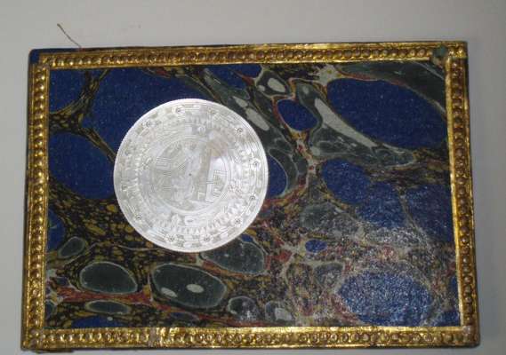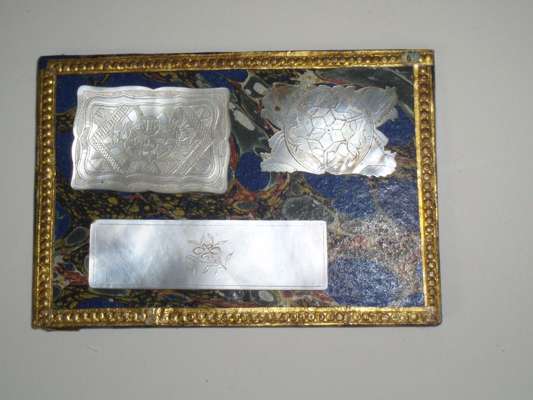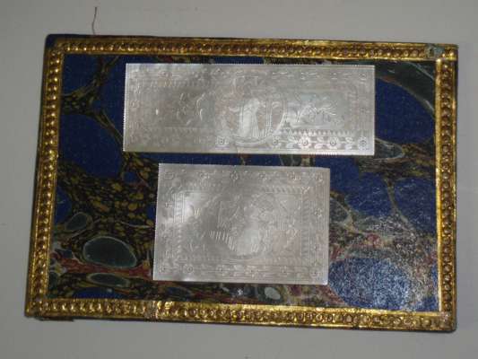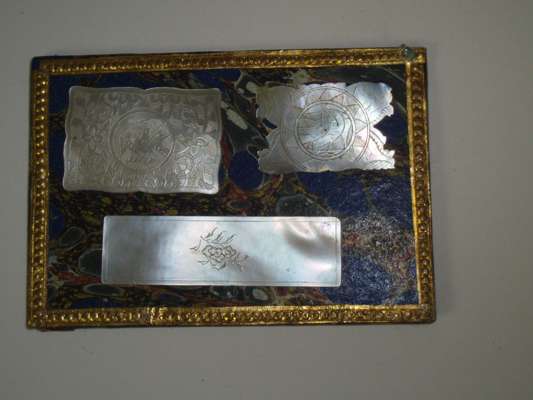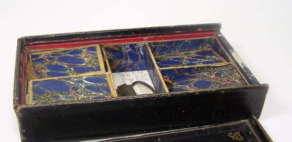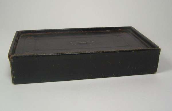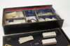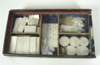 each decorated with a crest and motto 'Intemerata Fides' to one side and a Chinese figure to the reverse, each surrounded by stylised flowers, comprising: seventy-nine long rectangular counters, 6cm wide; fifteen rectangular counters, 4cm wide; thirty-six circular counters, 3.5cm diameter; together with a some later counters, including a collection decorated with a flower sprig to each side, comprising: thirty-five long rectangular counters, 5.8cm long; six rectangular counters, 3.5cm long; and twelve circular counters, 3.2cm diameter; seventy-two various fish form counters; and a number of various rectangular, shaped and circular counters, all contained in a tooled black leather box (qty)