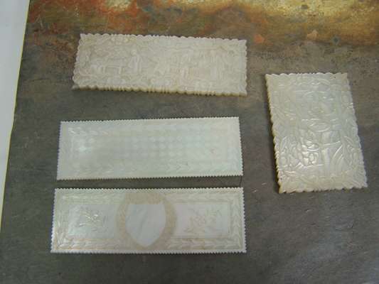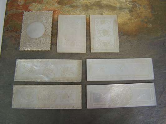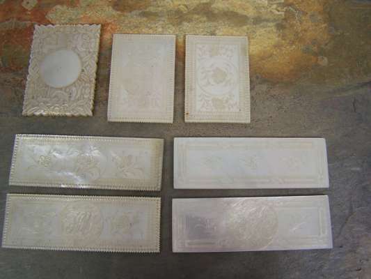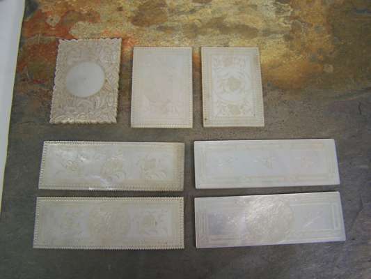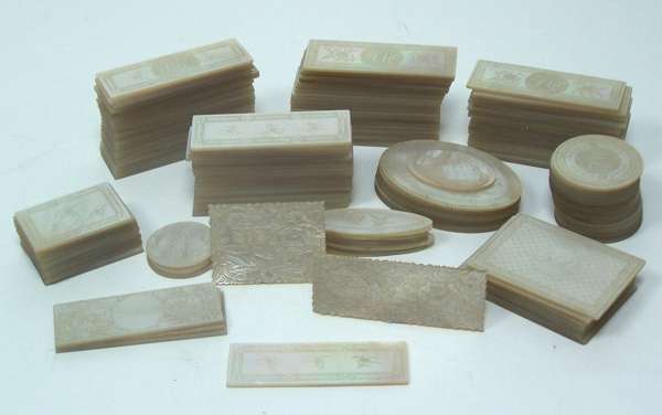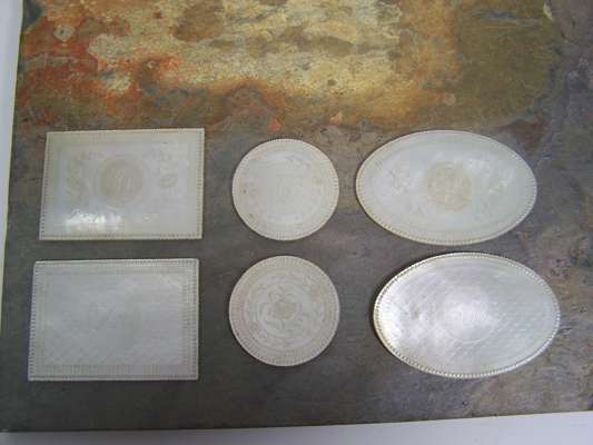 comprising: sixty-two elongated rectangular counters with conjoined scroll initials and decorated with flowers, 6.5cm wide; fifteen matching circular counters, 3.5cm diameter; and nine rectangular counters, 4.2cm wide; together with another similar set, with a number value on the reverse, comprising: eight large rectangular counters, 5.5cm wide; and eight oval counters, 6.2cm wide; sixteen, possibly later, elongated rectangular counters, with the initials 'GA' and decorated with flower sprigs, 6.5cm wide; and a small quantity of various other counters (qty)