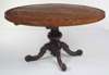 the top with moulded edge and parquetry inlay whilst the outer border is composed of two bands of interlocking octagonal motifs, originally of folding design for nomadic use, now fixed and with an associated Victorian pedestal with snapover action, on a boldly turned column and lappet carved quadruped scrolling base