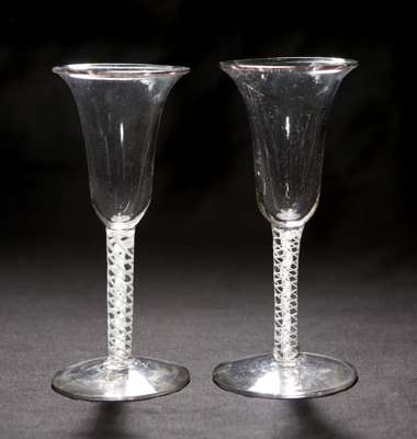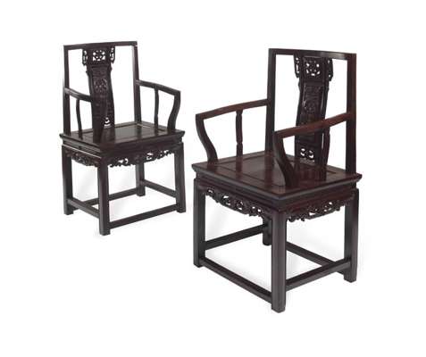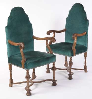 A pair of walnut framed high back armchairs In the William and Mary manner