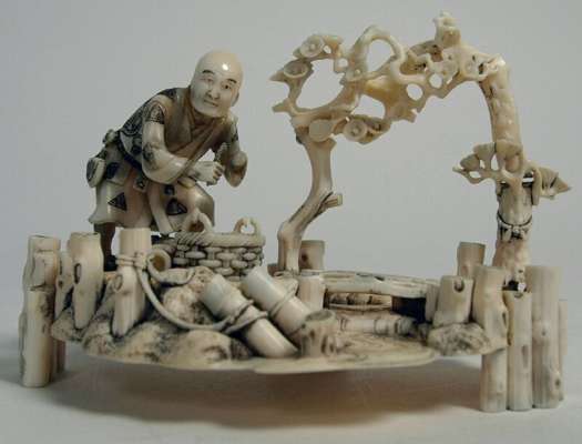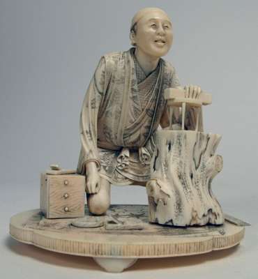 A Japanese carved ivory okimono of a carpenter, Meiji period